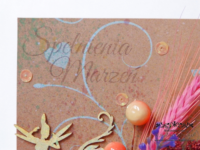 W ramach wyzwaniowej inspiracji przygotowałam kartkę peeełną polnych kwiatów, źdźbełek i innych badylków i listków. Oczywiście wykorzystałam niebieskie Craftowe Marzenie, które kilka razy prysnęłam mgiełkami. Do tego tekturka z polnymi elfami, którą niedbale - tu i ówdzie - przeciągnęłam miętową inka gold. Na końcu odbiłam stempel.