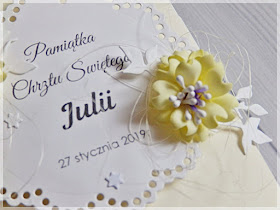 Komplet z okazji chrztu świętego, który przygotowałam z kremowego papieru wiztówkowego, delikatnie prążkowanego. DO tego efektowne kwiaty z foamiranu, trochę ozdobnego sianka, kilka scrapkowych listków, gwiazdki oraz szeroka tasiemka.